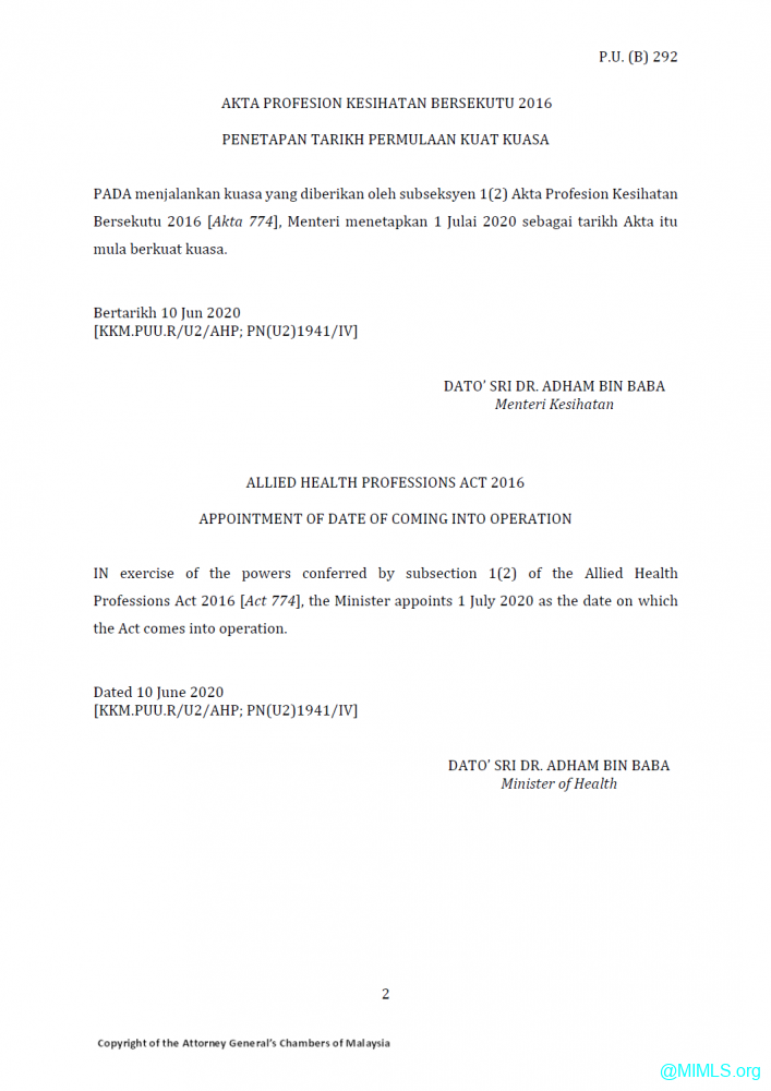 The Malaysian Institute of Medical Laboratory Sciences (MIMLS) welcomed the Ministry of Health Malaysia's move to appoint 1 July 2020 as the date on which the Allied Health Professions Act 2016 (Act 774) comes into operation. The Allied Health Professions Regulations (Fees) 2020 was also gazetted on the same day and came into force on the same day as the Act.